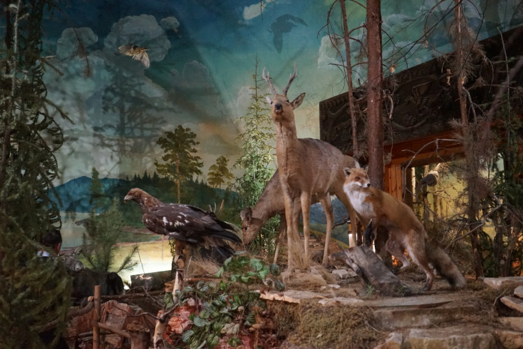Живописный зимний пейзаж с животными и птицами нашего региона украшает фойе музея, а на стене представлены основные лесообразующие породы Республики Башкортостан и интродуценты.